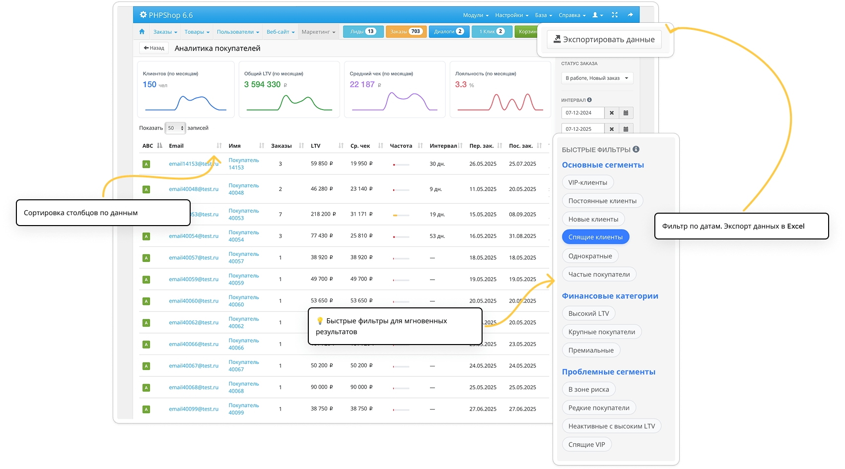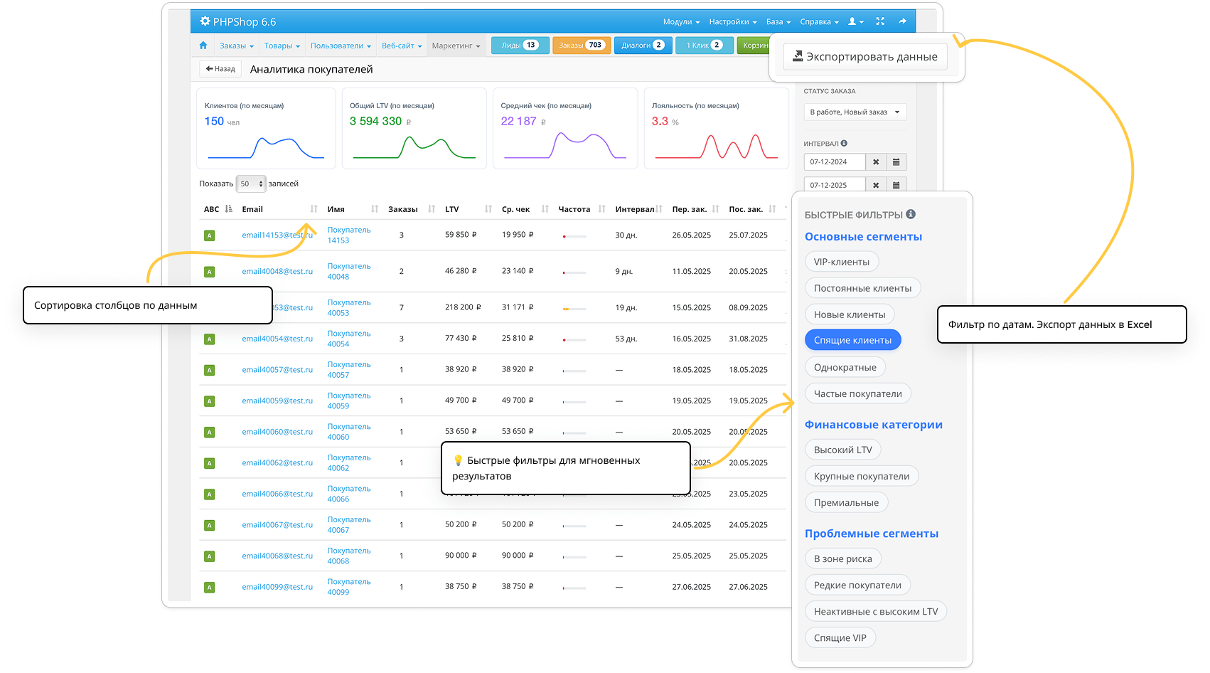 В меню Маркетинг - Аналитика можно увидеть данные ваших покупателей за всю историю, отфильтровать по нужным периодам, применить фильтры и экспортировать нужные сегменты покупателей.