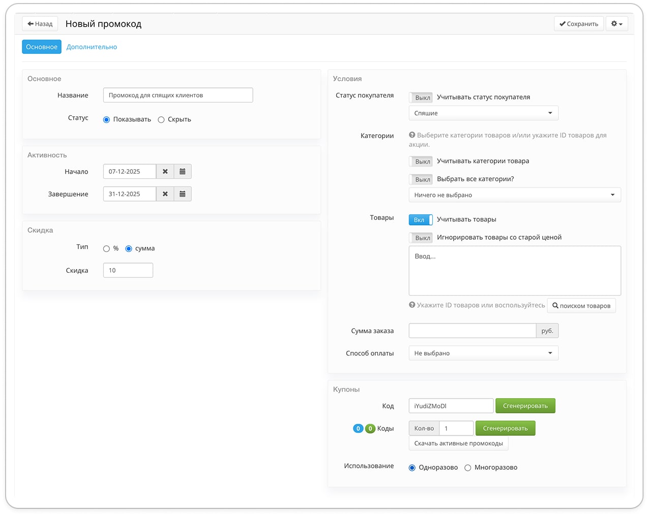 После этого можно отправить им персональное письмо с эксклюзивным купоном (меню Модули - Промокоды) или предложить бесплатную доставку или подарок за следующий заказ.