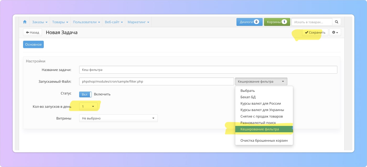3. В открывшемся окне выберите Кеширование фильтра, установите периодичность выполнения задачи.