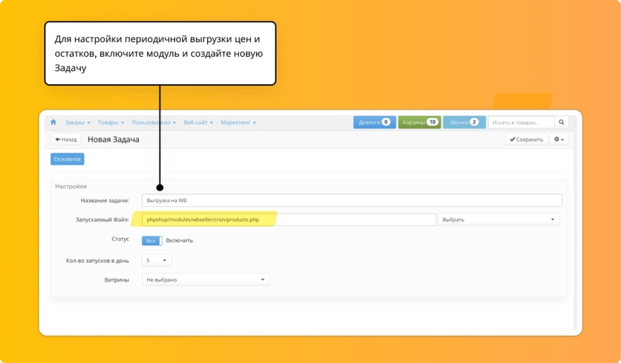 Можно настроить загрузку заказов по расписанию: 10, 20, хоть 100 раз в день. После настройки расписания, заказы будут приходить в магазин несколько раз в день.
