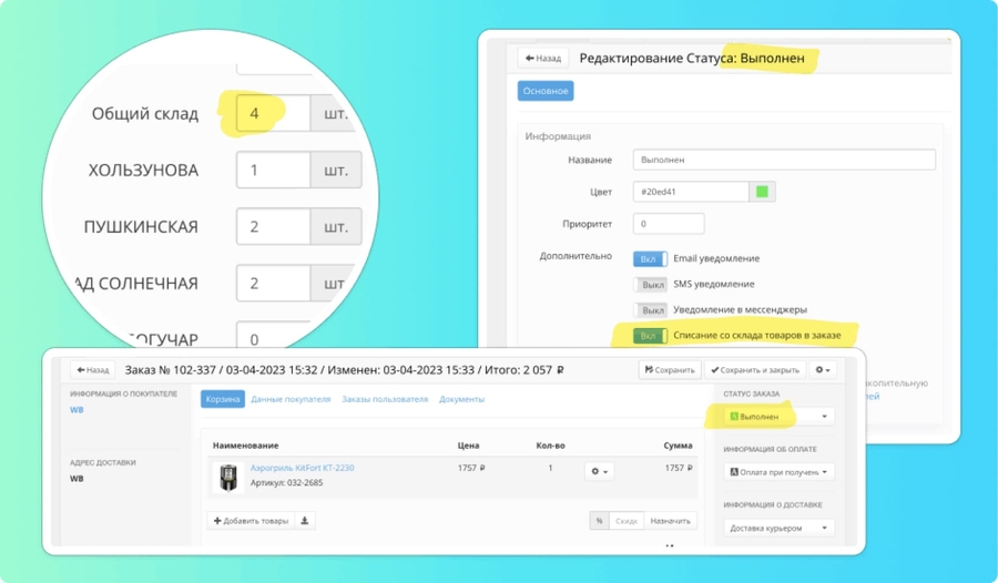 Складские остатки можно также списывать автоматически и синхронизировать между всеми подключенными маркеплейсами. Для этого нужно указать, в каком статусе будет приходить заказ. В статусе отметить опцию - Списывать со склада.